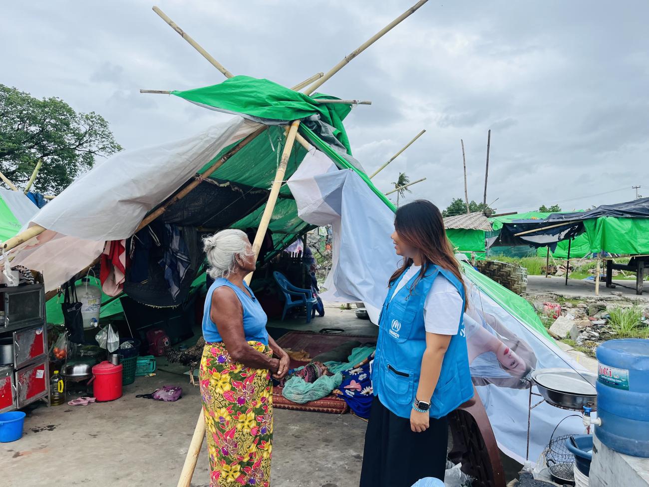 Daw Swe Win and her family now live in a temporary shelter alongside other displaced families, trying to rebuild a sense of stability, safety, and daily routine amid the compounded challenges of displacement and disaster.